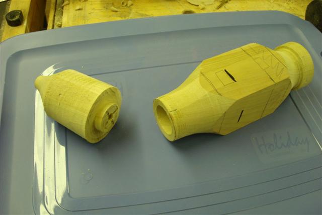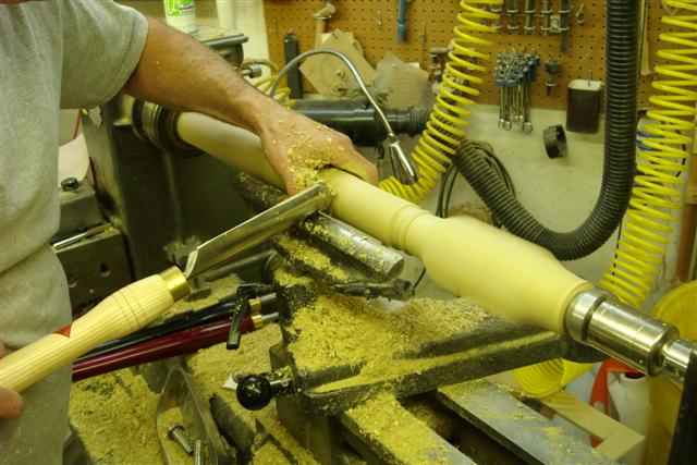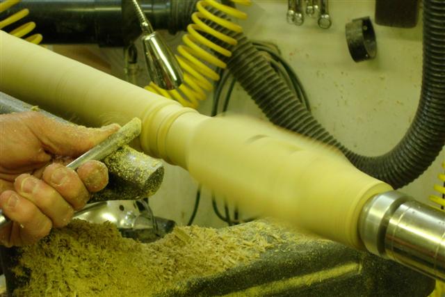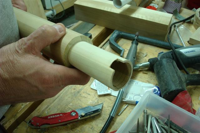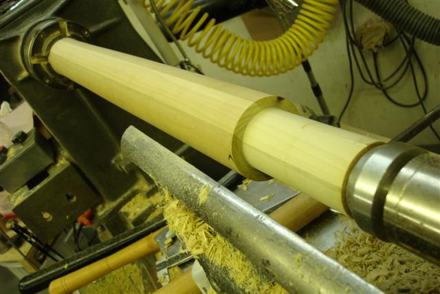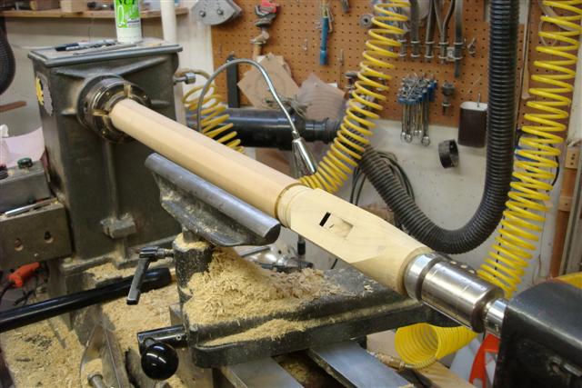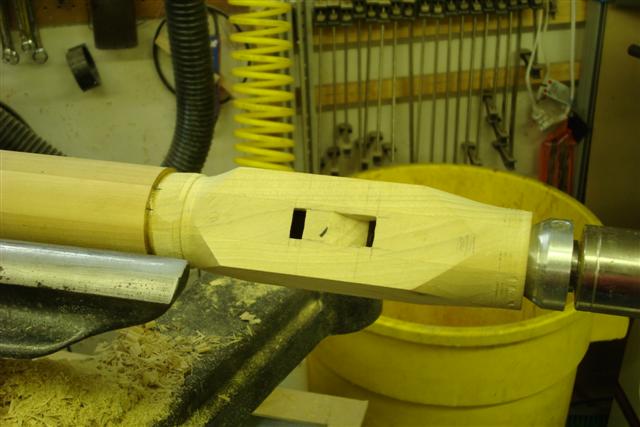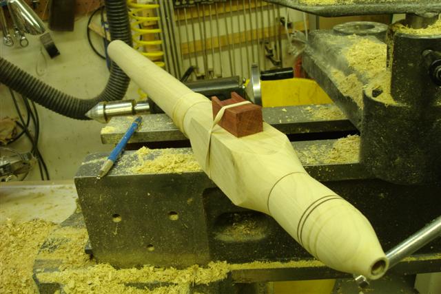 The body was mounted between centers and a teno turned on one end. This tenon must slide all the way up to the back of the TSH. The fit had to be tight.